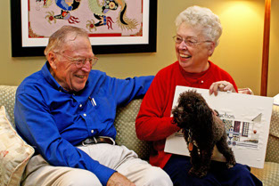 "A few years after retirement, we decided that a large yard with a substantial hill needing constant attention was a good reason to downsize to a smaller yard and home. It was a family decision that Wesley Village would be just the place. We and Rock, the family cat, have made a fine adjustment to our new home. You might see Rock peeping out the front window."
